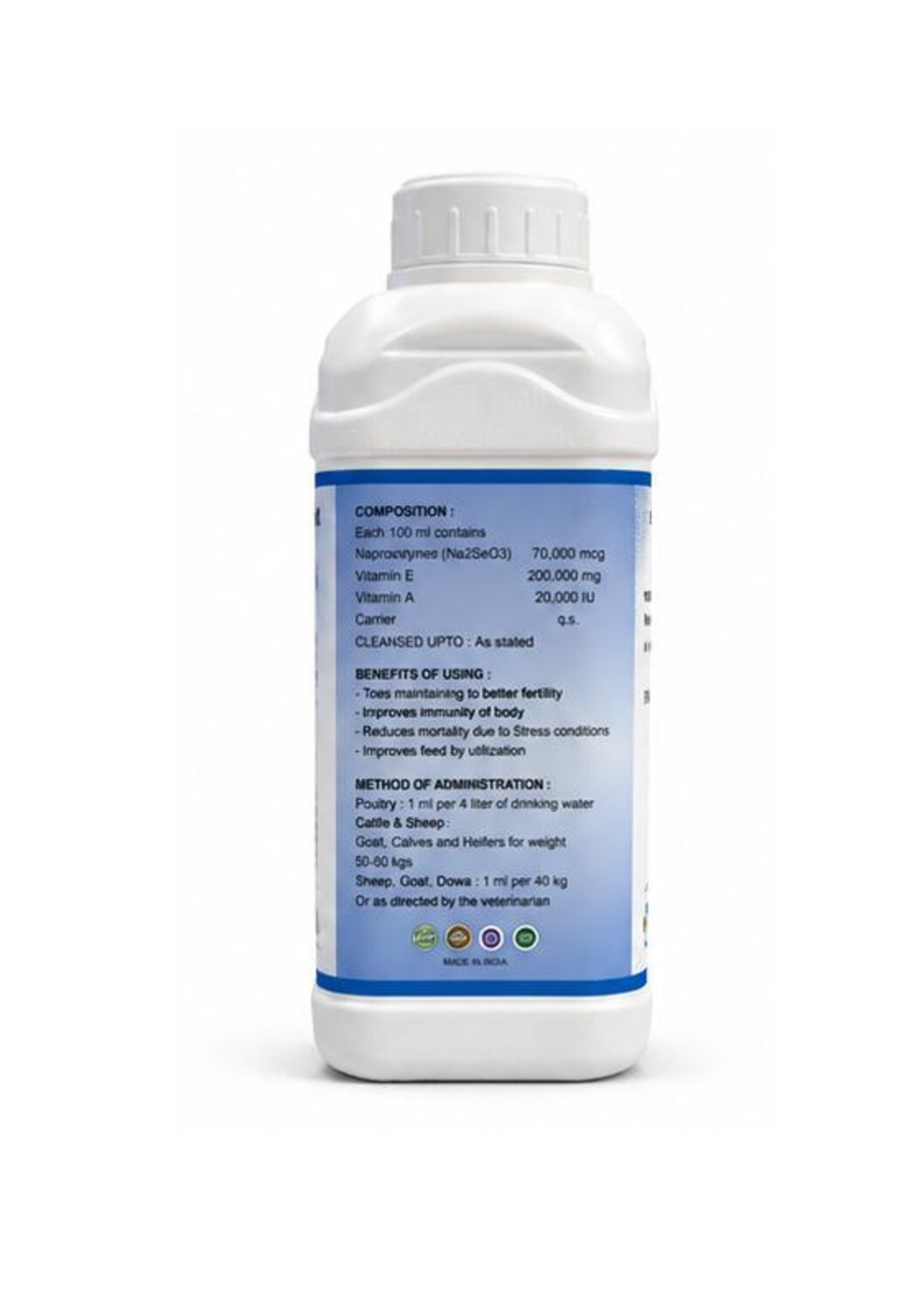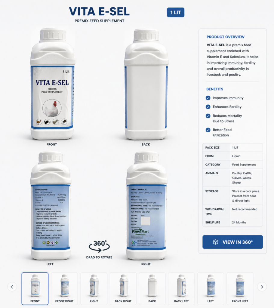 VITA E-SEL is a carefully formulated liquid feed supplement designed to deliver an optimal combination of Vitamin E and Selenium for poultry and livestock. Developed to improve immunity, enhance fertility, and support overall health, it is suitable for use during periods of stress, growth, and production.